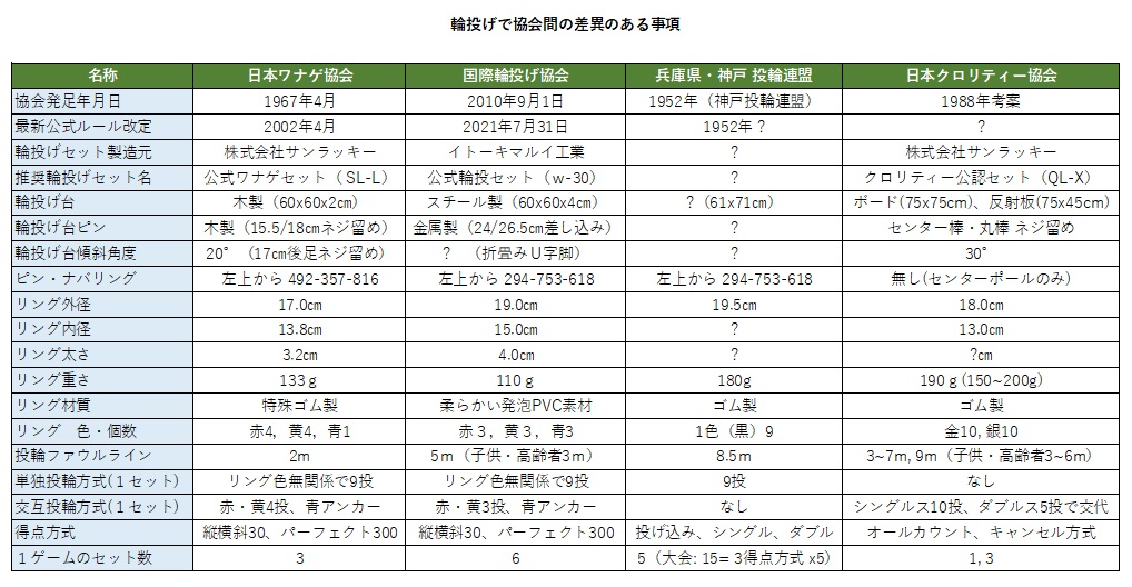 左右の挿絵で分かるように、左が「日本ワナゲ協会」の、右が「国際輪投げ協会」が標準としている輪投げセットですが、ピン番号の付け方やリングのカラーの振り方とその個数、リングの直径・重さ・材質等も微妙に差異があります。 協会が「日本」や「国際」と謳っているが、外国で日本の輪投げセットが普及している訳でもないと思うので、余り言葉に意味はないと思われます。 しかし、東老連や傘下の区・市老連の大会では「国際輪投げ協会」指定の道具およびルールが適用されており、競技会を目指している方は、どの競技会なのかを考慮する必要があるかと思います。 当方の印象では、「日本ワナゲ協会」は万人向き親しみ易さ・娯楽性に重きを置いており、「国際輪投げ協会」は技能・スポーツ性に重きを置いているように感じます。 又、「兵庫県、神戸投輪連盟」は8.5mの長い投輪距離や、独特の投げ込み・シングル・ダブルの3得点方式をセットにした競技など、競技スポーツに重きを置いております。 違いに関しては拙者が後述「各協会間の用具・ルールの違いについて」の項にてまとめてみましたので、そちらを参考にして下さい。 日本ワナゲ協会指定の道具と公式ルール