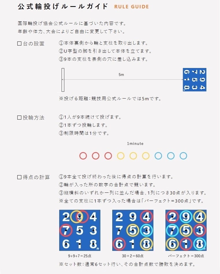 ![]() ![]() ![]() ![]() 国際輪投げ協会のホームページはこちらです。 なお、公式ルール詳細に就いてはこちらのPDFをご覧下さい。 又、輪投げ台の組立方はこちらのビデオをご覧下さい。 試合に使う参考の得点表はこちらを印刷してお使い下さい。 注:当方所属クラブでは、1回戦=5セット、各セット毎の小計欄、公式ルール/大会ルール共用で使用出来て、1枚で表裏使用で2回戦迄可能に多少変更した8人用得点表(表・裏)を使用しています。 又、各セット毎の小計欄は試合中でも誰がどの順位に居るかが分かってとても便利です。 1回戦のセット数はケースバイケースで大会やクラブで異なることがある為、総合点での比較が出来ないので、セットの平均点=総合点の10分の1の計算で出来る合計10セットを採用しております。 兵庫県・神戸投輪連盟指定の道具と公式ルール