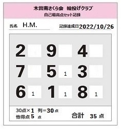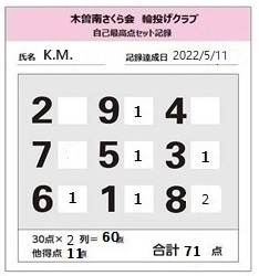 交互投輪方式をトライしてみました!いつもは単独投輪方式で練習試合を行っておりますが、たまには交互投輪方式も経験してみたいとの要望などがあり、トライしてみました。公式のルールに則て優勝者を決めるには、人数が多い場合リーグ戦やトーナメント戦形式で行うと試合数が多くなり大変なので、 当クラブ独自の「グループ対抗簡易交互投輪方式」を行ってみました。興味のある方はこちらに載せてあります。 メンバー記録ハイライトBest score 記録