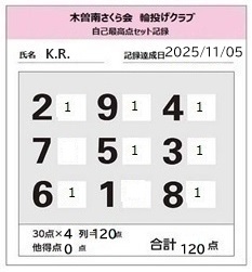 🥈 K.R.さん 2025/11/05 120点更新 ←2023/05/03 91点達成 🥉 K.Y.さん 2024/03/27 97点更新 ←2023/04/26 73点更新 ←2022/09/28 67点更新 ←2021/11/13 60点達成 M.Y.さん 2022/08/10 94点更新 ←2021/10/25 67点達成 E.F.さん 2022/03/23 90点達成 K.M.さん 2022/11/09 71点更新 ←2022/05/11 47点更新 ←2022/04/27 39点更新 ←2021/03/02 38点達成 T.H.さん 2024/08/28 60点更新 ←2024/05/15 40点達成 ←2024/04/10 39点達成 Y.M.さん 2024/04/03 60点更新 ←2021/11/03 41点達成 I.N.さん 2022/05/04 43点更新 ←2021/03/23 39点達成 T.F.さん 2024/12/18 38点達成 H.M.さん 2022/10/26 35点更新 ←2022/07/27 20点達成 No-miss 記録![]()