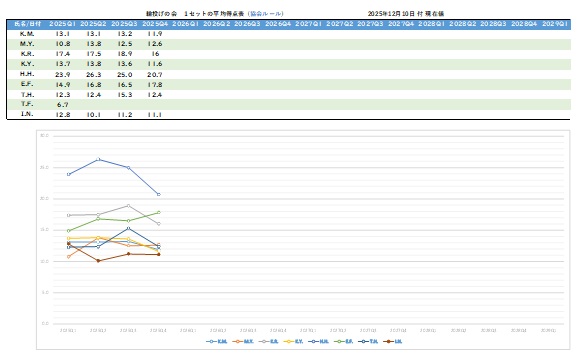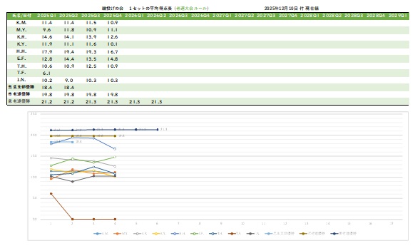■過去からの平均スコア及びグラフ毎週の練習の成果は短期的には上がり・下がりが大きく変動しますので、過去からの四半期毎の平均スコアの表及びグラフにより、長期的な傾向が分かるようにしています。協会正式ルールと東老連大会ルールの二通りのポイント方式で表示しております。